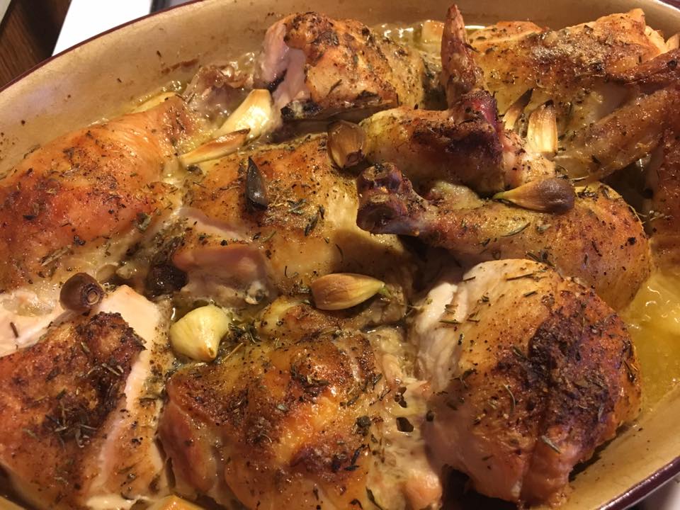 Season the chicken pieces liberally with the Signature Seasoning and some fines herbes. Penzey's has a great fines herbes, it's one of my favorites. Arrange the pieces in the dish and tuck a handful of peeled garlic cloves in and around the chicken pieces, and drizzle with a couple tablespoons of the garlic olive oil. Pop in a 375 degree oven and roast for an hour and thirty minutes, until the chicken is golden brown, and the skin is super crispy and chicken is cooked.